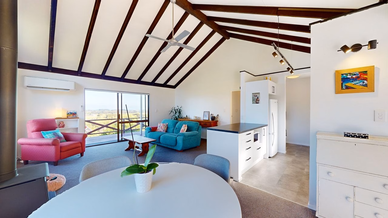 Comfortable Living: The open-plan living, dining, and kitchen area features a chapel ceiling, enhancing the sense of space. A modern heat pump + wood fire ensures year-round comfort.