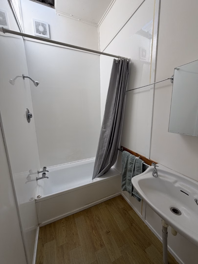The home offers 2 bedroom spaces, including a unique mezzanine-style room filled with character. The bathroom includes a shower-over-bath and separate toilet.